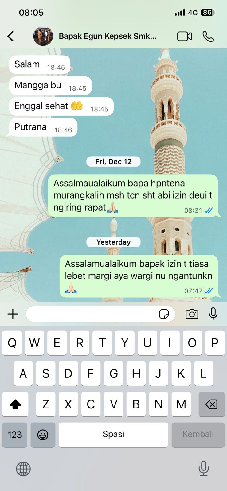 | 2026-02-12 | Rd. Adhi Indra Kurnia | Kamis | Jam 1 | X RPL B | Izin Kepsek | Lihat |